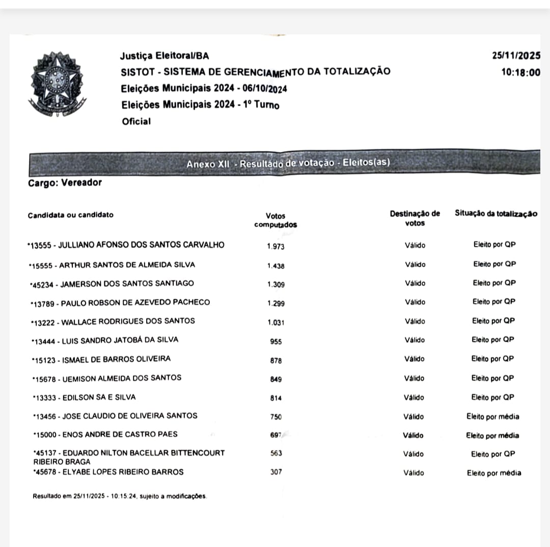 Segundo a Justiça Eleitoral, os três estão aptos para serem diplomados, e a posse está prevista para a próxima segunda-feira (1º). A nova composição consta no relatório oficial do sistema de totalização do TRE-BA, que atualizou a distribuição das vagas após a decisão judicial.