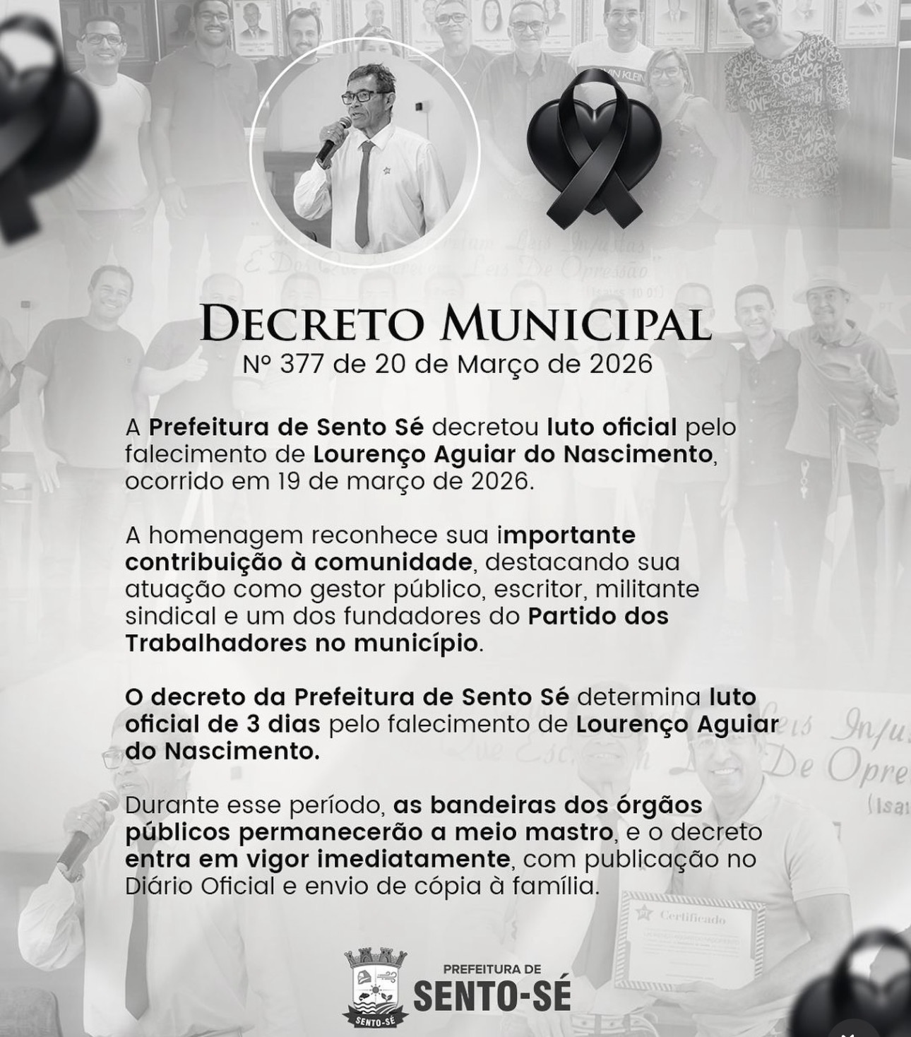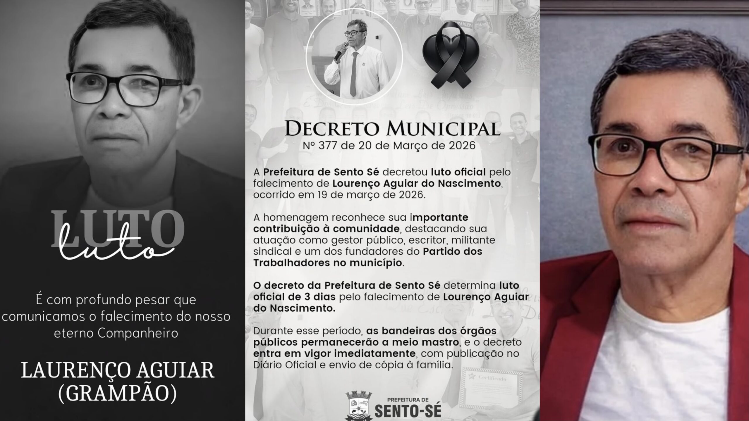 A Prefeitura de Sento Sé decretou luto oficial de três dias pelo falecimento de Lourenço Aguiar do Nascimento, ocorrido nesta quinta-feira (19). A medida foi oficializada por meio do Decreto Municipal nº 377, publicado nesta sexta-feira (20).